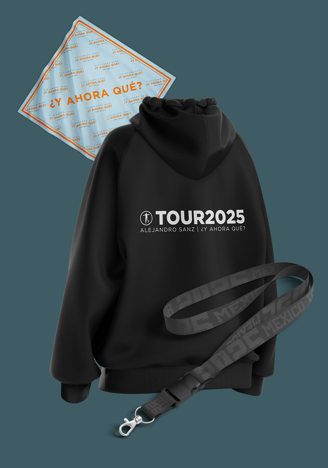 HOODIE NEGRO ALEJANDRO SANZ - TOUR 2025 + BANDANA AS - ¿Y AHORA QUÉ? - CELESTE + CORREA/LLAVERO 2 EN 1 "MÉXICO 2025" - NEGRA